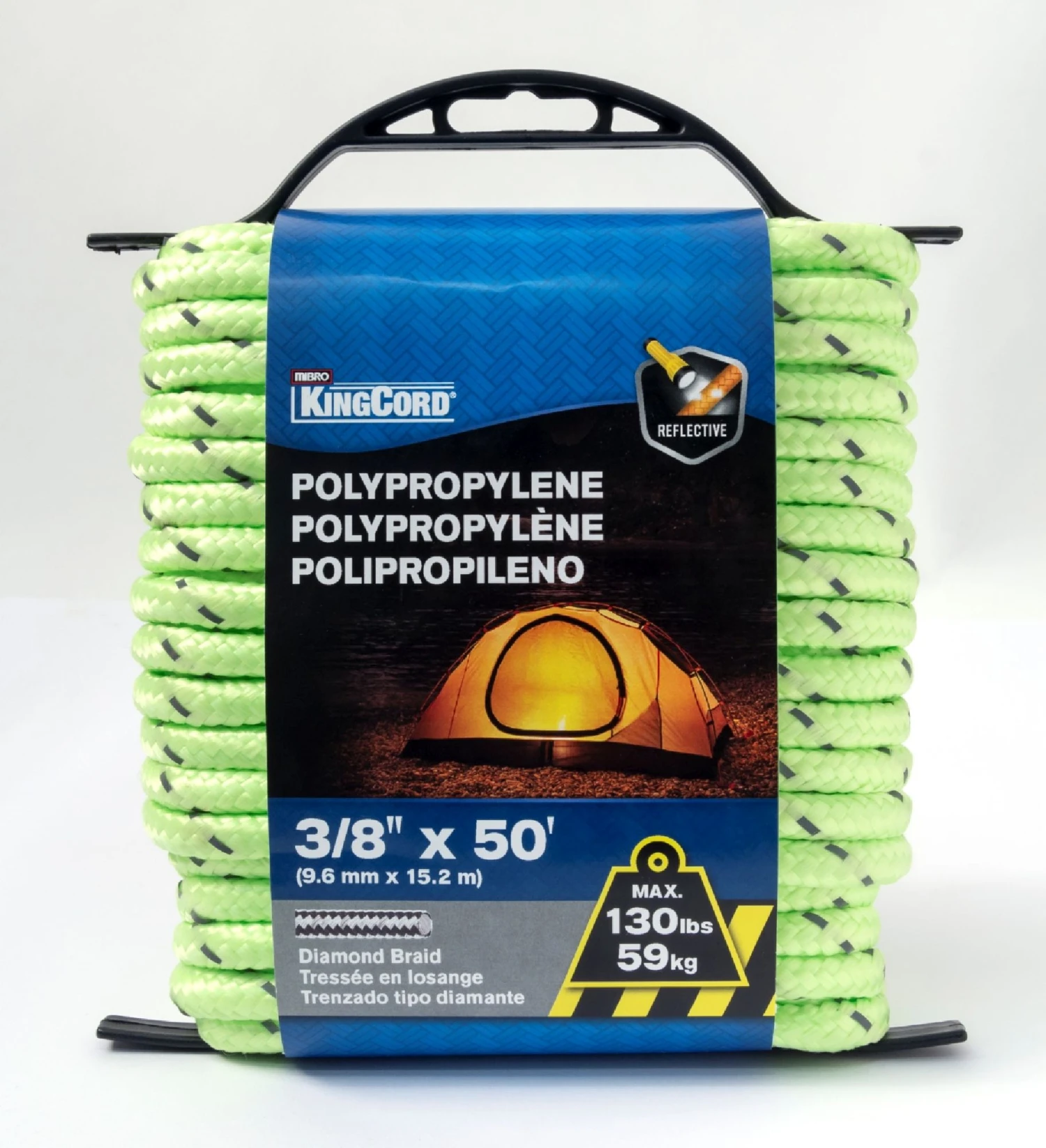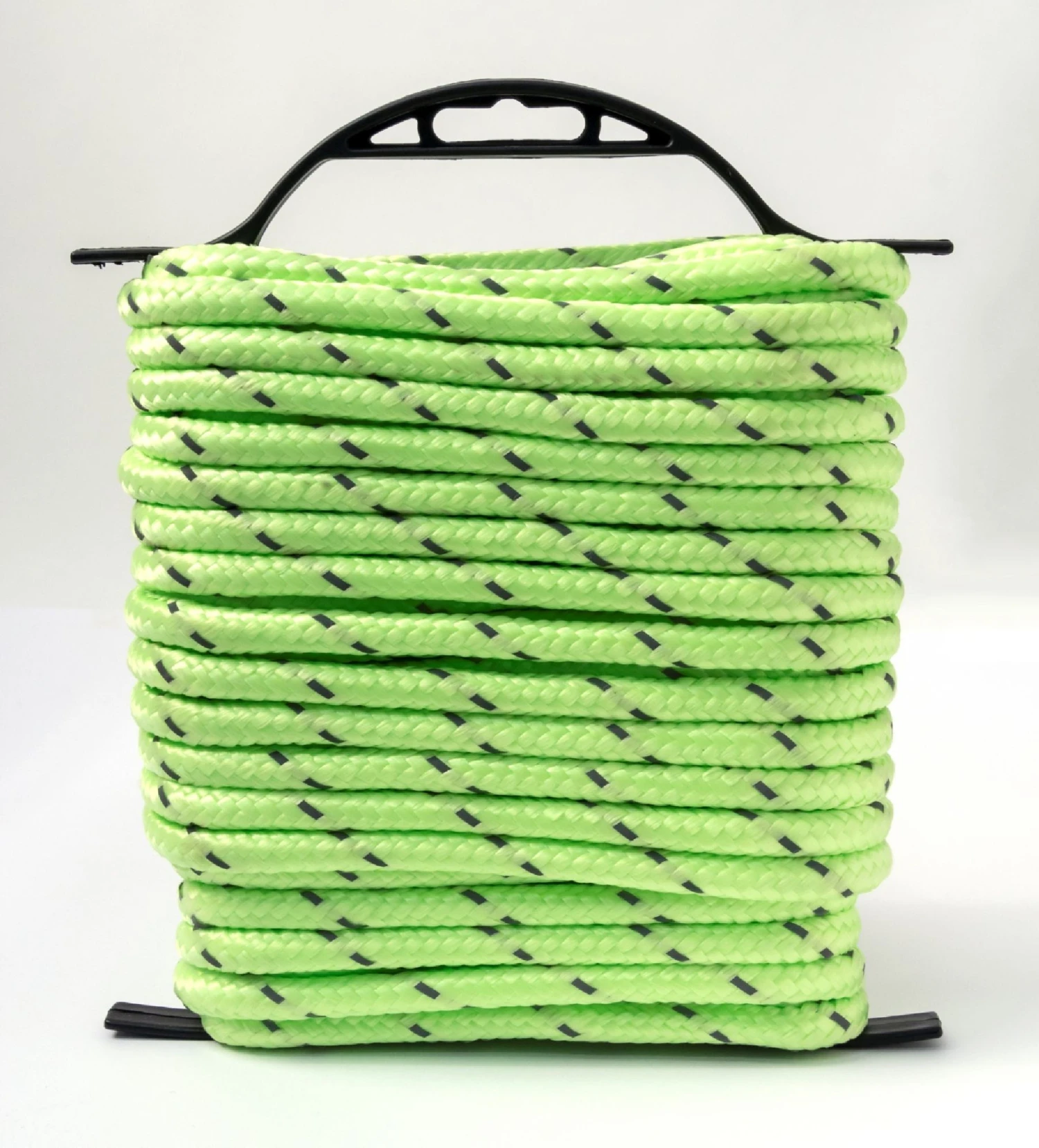 Be seen! Reflective Diamond Braid Polypropylene is one of the most popular ropes and constructions for general outdoor use. Whether it’s being used for camping or other outdoor recreational activities, this rope is a great general purpose choice. The rope’s reflective tracer makes it visible at night from more than 100′ away. Polypropylene floats, so it’s also especially useful for water-based activities and applications. The Diamond Braid construction has the best lifespan of all the braided ropes. This rope comes on a rope holder which is convenient for wrapping and storing the rope when it’s not in use. (1-5-02767)