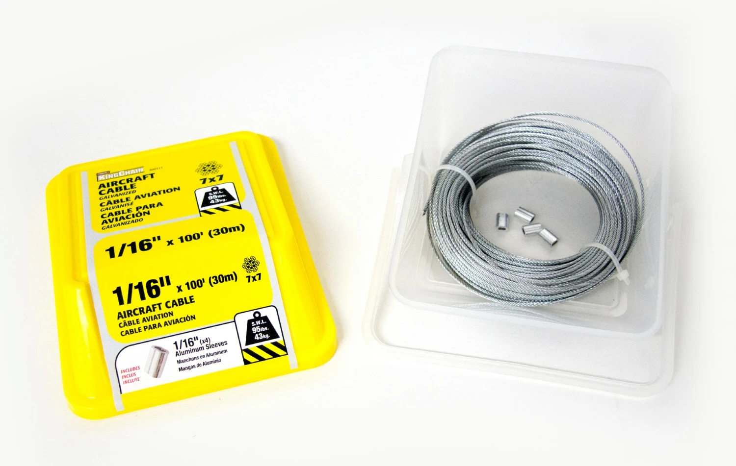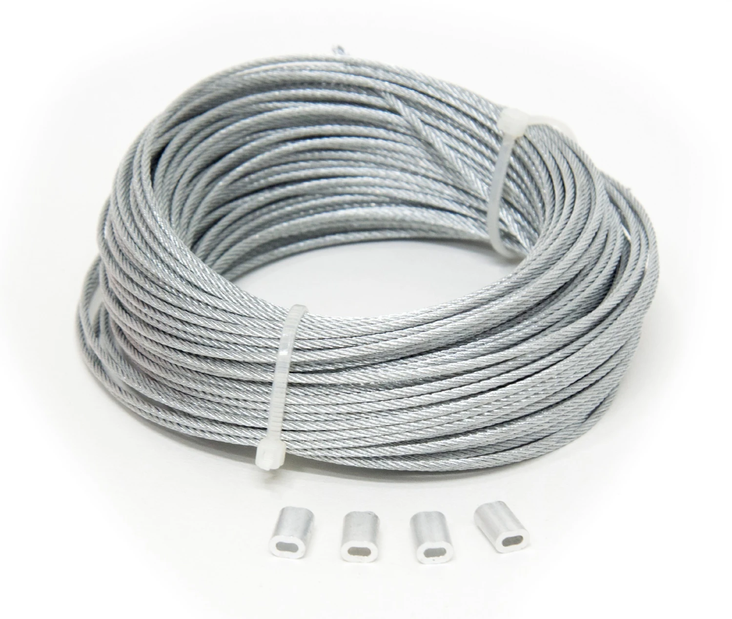 Aircraft cable is wire rope that consists of 7 or 19 individual hot dipped galvanized steel wires that are laid in a spiral around a center or “king” wire to form a strand. The strands are then twisted together to form a cable. If a larger number of thinner wires are used to make a strand, such as 19 in a 7 x 19 cable, the finished cable is more flexible, stronger and more expensive. Typical uses include garage door cables, tie downs, dog runs, hanging signs and guy wires for antennas and flagpoles.