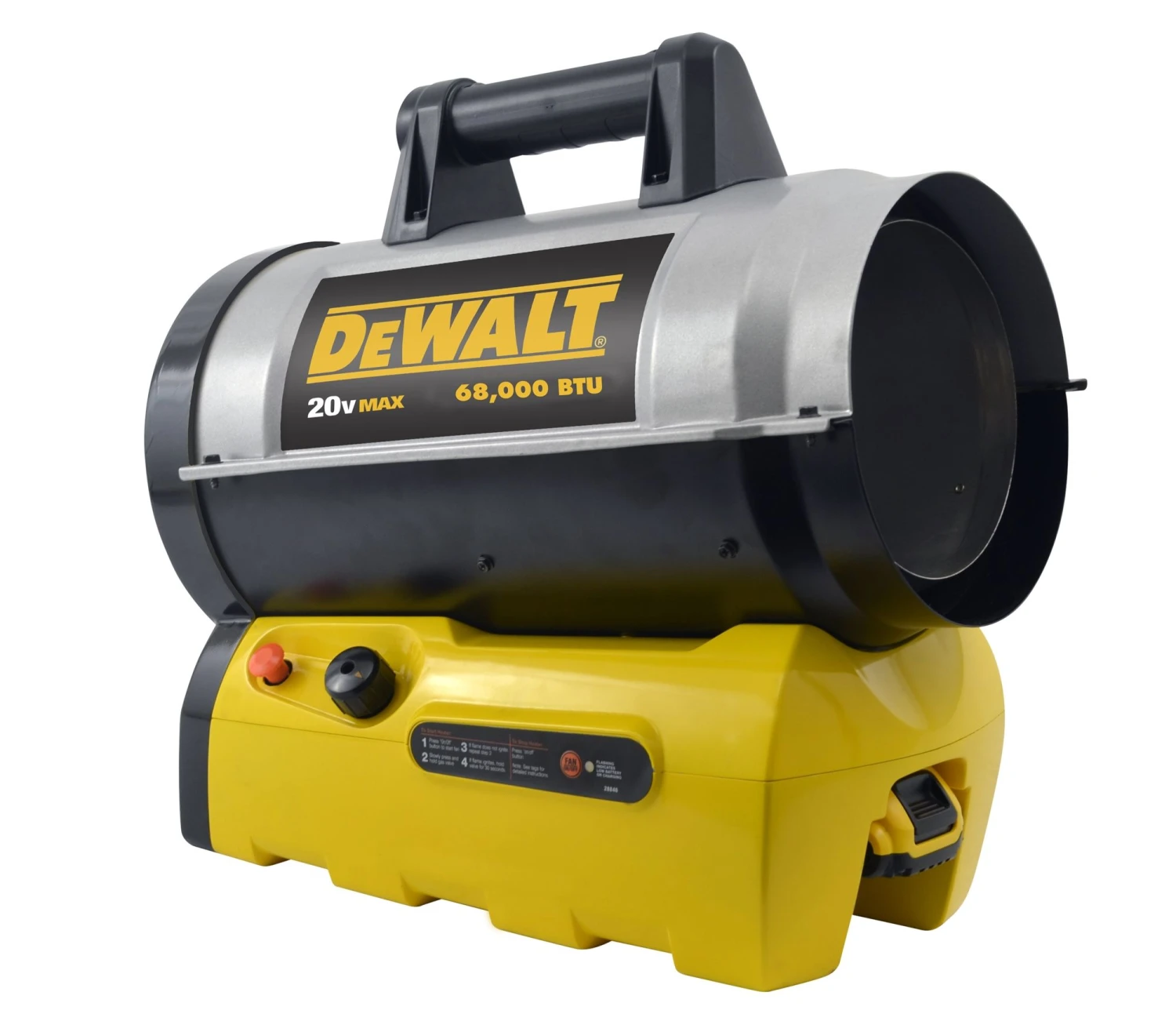 The 20V MAX* 70,000 BTU Cordless Forced Air Propane Heater comes standard with a hose, regulator, and all the safety you would expect from DEWALT products. Equipped with factory installed high limit switches and a thermoelectric safety valve you can feel comfortable using this heater on any jobsite. Just insert any 20V MAX* or 20V/60V MAX* FLEXVOLT® batteries into the heater, hook up the included hose and regulator to a propane tank, and you are ready to cut the cord and take this heater anywhere.