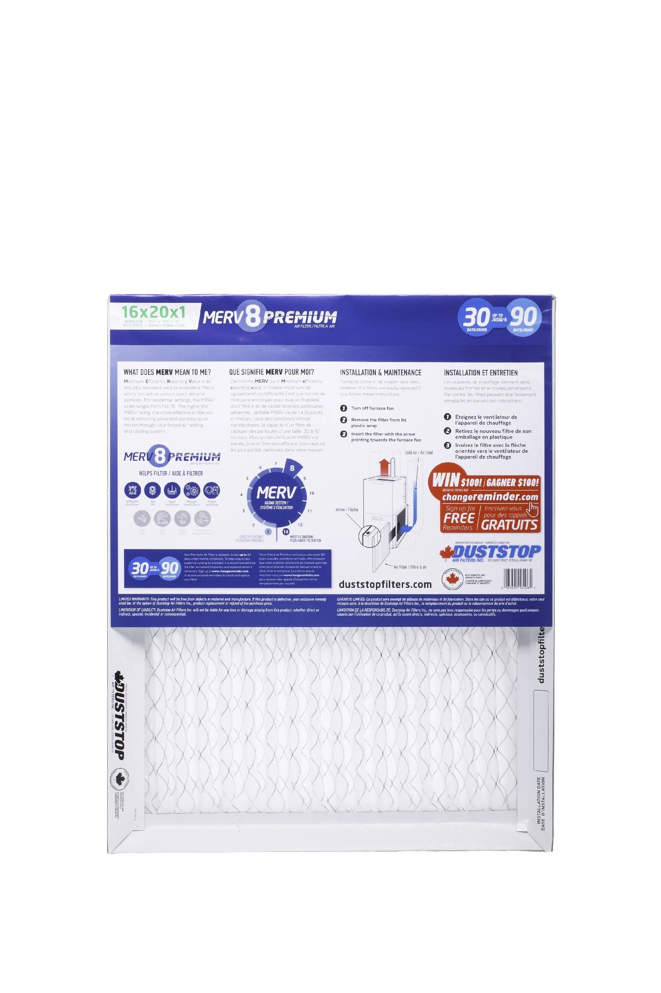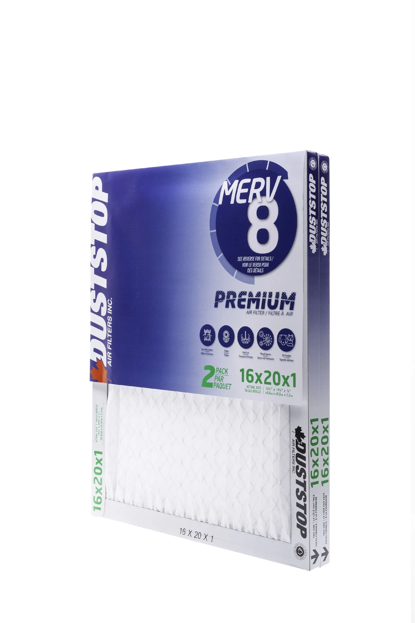 Designed for households requiring increased efficiency over regular fiberglass filters- Helps remove dust, pollen, mould spores, pet dander- MERV 8 Rating Effective filtering life between 30 and 90 days Manufactured in Canada with domestic and imported parts