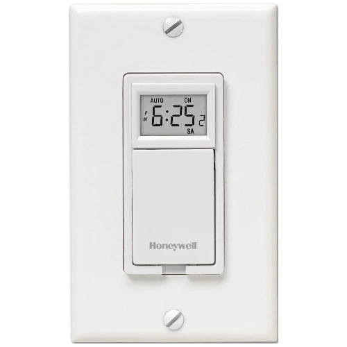 Programmable switch. 500 W. 4.2 A. 120 V. Made of plastic. Wall model. For incandescent, halogen or fluorescent light. Single pole or multiswitch (3 ways) installation. Manual ou automatic operating mode. 7 days programming, 14 events. Rechargeable battery against power failure included. Maximum 1 H.P. White.