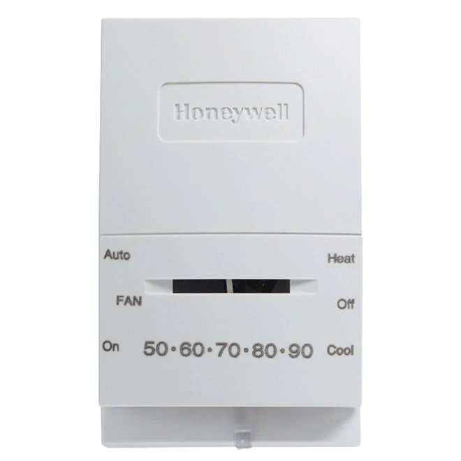 Honeywell non-programmable mechanical thermostat for heating and cooling systems. It is a standard model and is easy to install. It allows precise control of the temperature and is equipped with a bi-metal temperature sensor. It offers simple, worry-free operation. Its temperature range is 10°C to 32°C (50°F to 90°F). Mercury-free.