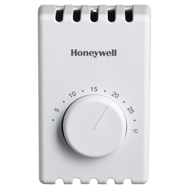 The Honeywell single-pole residential thermostat for 2-wire 120 V or 240 V heating systems has a mechanical temperature control system. The device includes an energy saver that maintains optimal performance for your baseboard heaters.