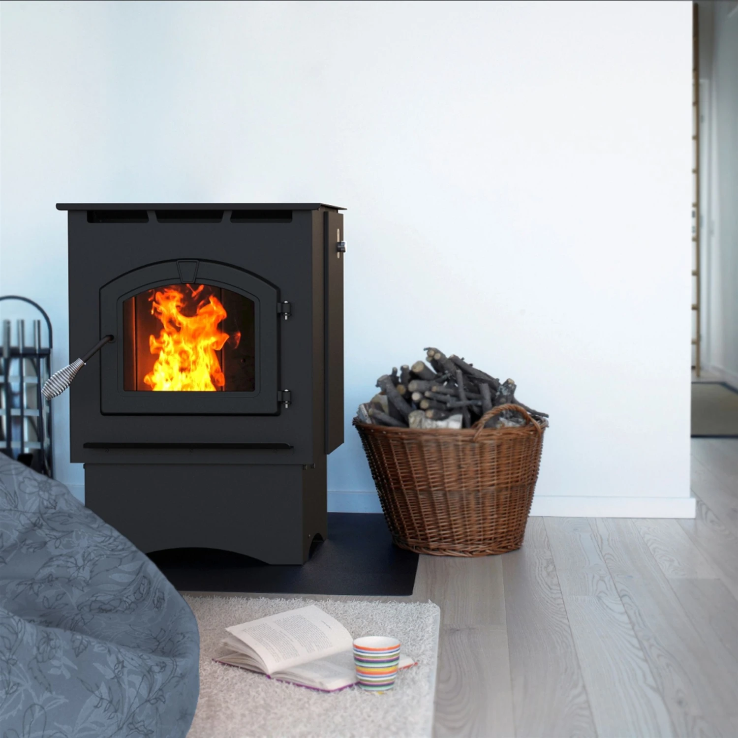 Here, perfect for single-family or mobile home use with little assembly required. This Pleasant Hearth pellet burning stove has an air wash system for cleaner air, spring chrome handle, a solid cast iron door featured with an arched decor, and a ceramic glass viewing area.