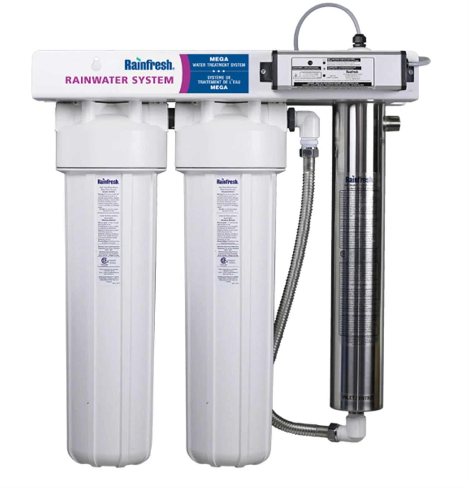 Advanced main line water purification system designed to convert rain water collected from roof tops, cisterns or other areas into clean, safe drinking water for the entire home