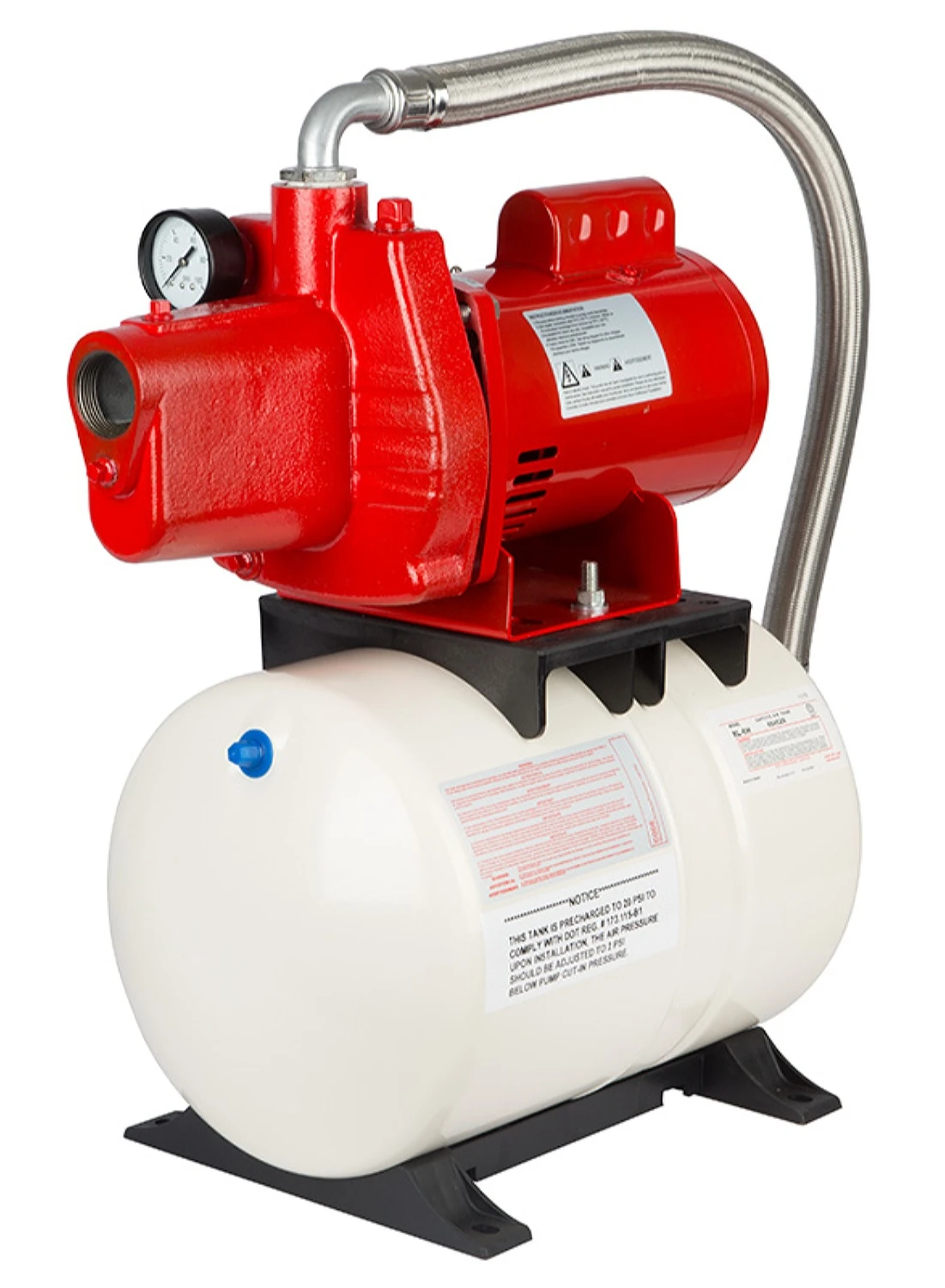 Ideal for the supply of fresh water to rural homes, farms and cabins where compact system size and ease of installation are most important.- Jet pump & pre-charged pressure tank are factory assembled and ready to install.- Pump casing is made of rugged cast iron.- Precharged steel tank has a high grade diaphragm water chamber.- Low profile, compact horizontal pressure tank.- Pressure gauge and foot valve included.- 1 1/4″ NPT suction & 1″ NPT discharge.- Includes 30/50 pressure switch.