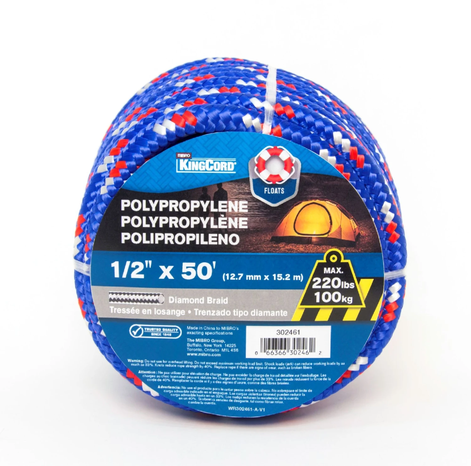 – This rope is 1/2 in. in diameter x 50 ft. in length- It holds up to 220lbs (100 kg) which is considered a Safe Work Load (SWL)- It is economical yet strong and splices easily- The rope comes in multiple colours and floats well- It is abrasion, rot and mildew resistant