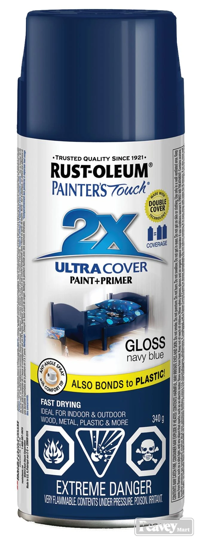 340 gm. Provides superior coverage on wood, metal, wicker and more. Covers surfaces with less spray passes, allowing projects to be completed faster and easier. Any angle spray feature allows you to spray in any direction, even upside down. Comfort spray tip with wider finger pad reduces fatigue caused by continuous spraying. 340 gm. Navy. (4-3-5146)