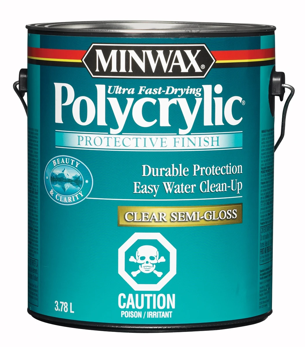 Minwax Polycrylic – A durable crystal clear, protective finish that is ultra-fast drying.Its low odour formula is water-based for easy clean-up.Recommended uses: Woodwork, cabinets, furniture, doors
